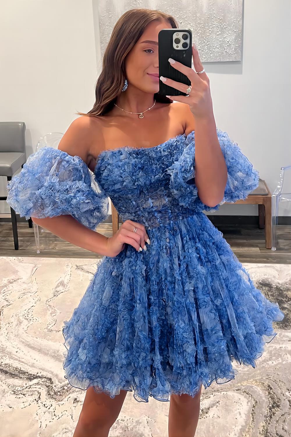 A Line Off the Shoulder Printed Above Knee Homecoming Dresses with Ruffle