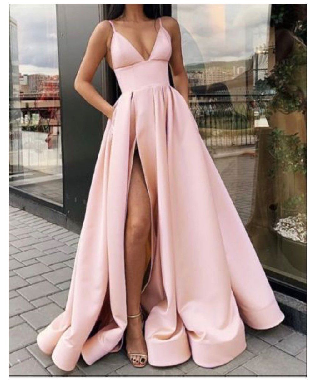SR1040,Pink Satin V-neck Evening Dresses,Long Slit Prom Gown