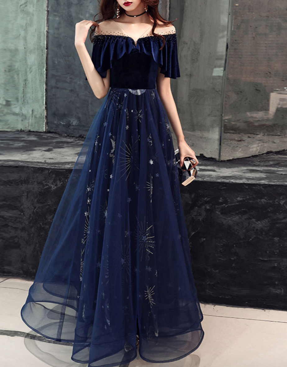 SR1051,Blue Tulle with Velvet Long Party Dress, A-line Off Shoulder Formal Dress Prom Dress