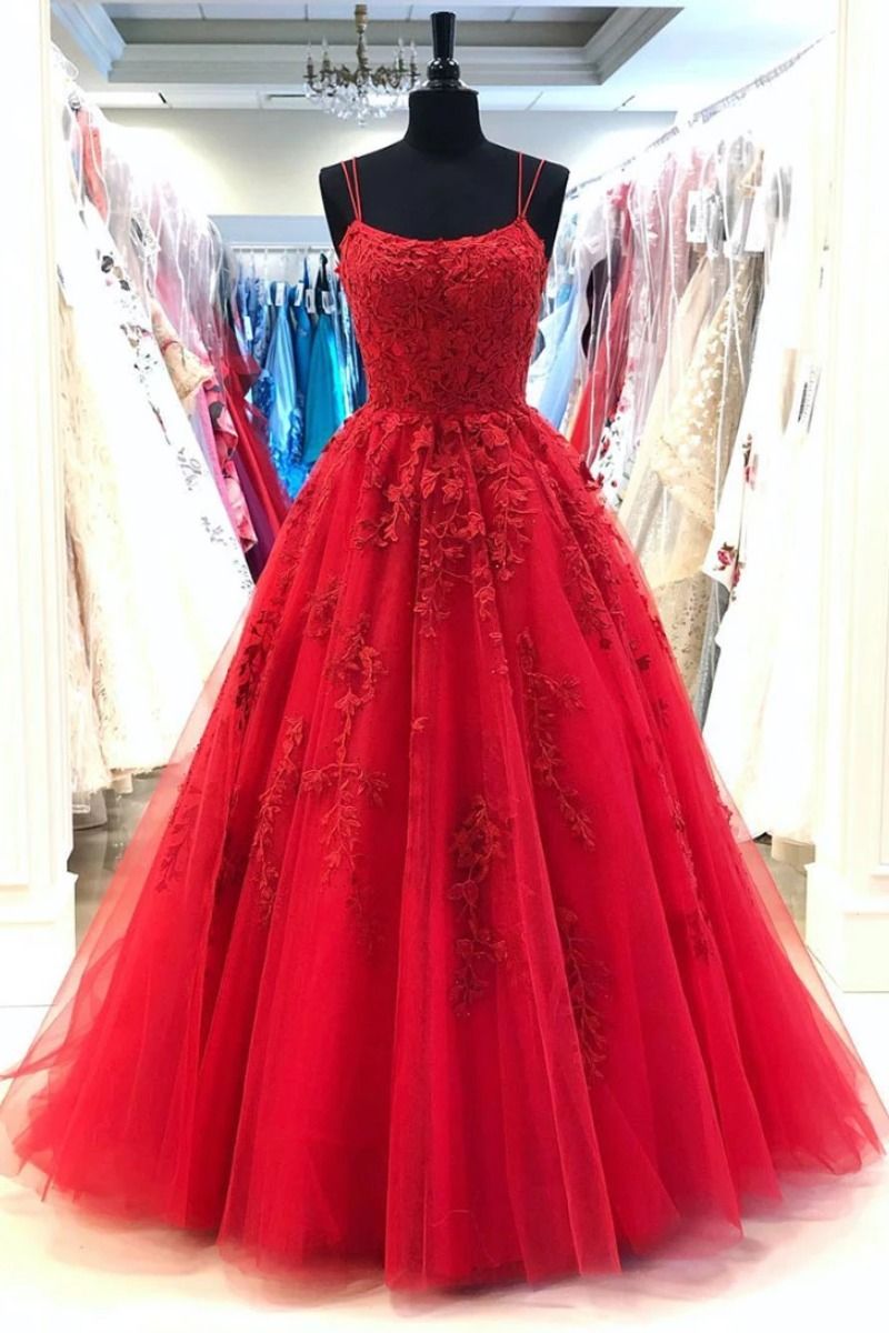SR1052,Red Lace Prom Dresses,Long Floor Length Evening Dresses,Spaghetti Straps Prom Gown