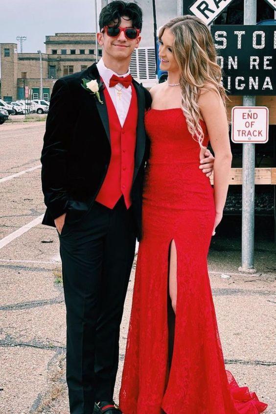 SR1175,Strapless Red Lace Prom Dresses Long Evening Ball Gown