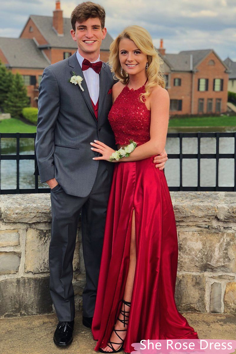SR1189,Charming Red Lace Top Halter Prom Dress with Split Side