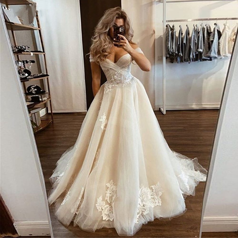 SR1206,Off Shoulder A-line Tulle Backless Wedding Dresses