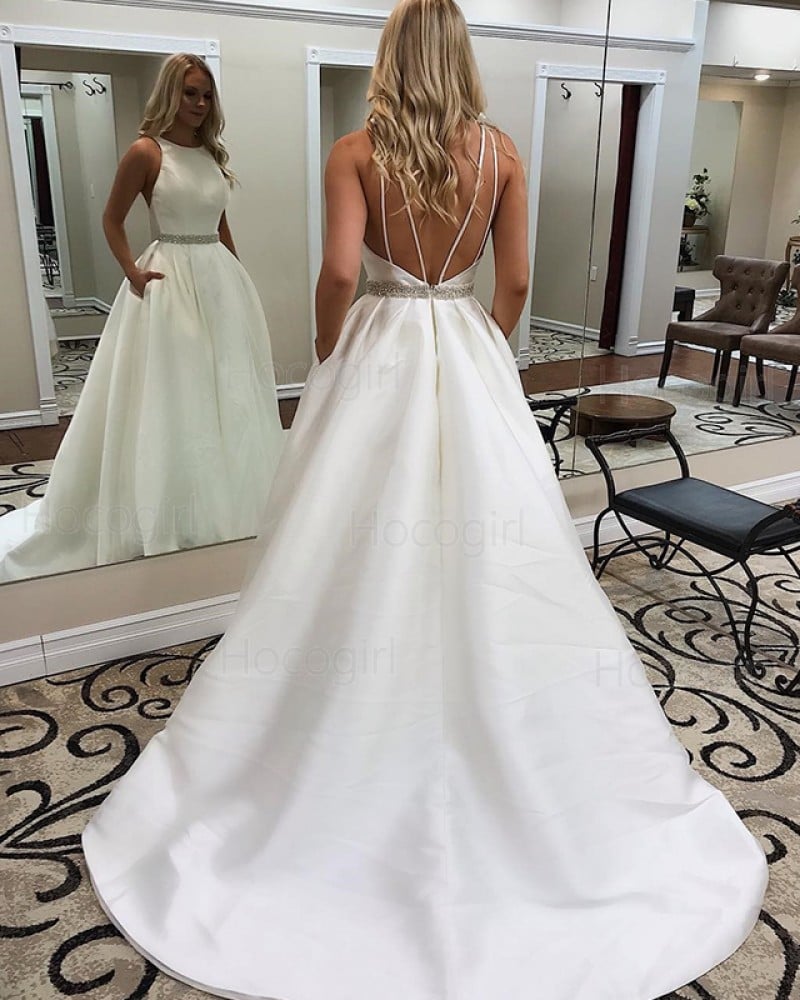 SR1224,Jewel White Satin A-line Simple Fall Prom Dress with Pockets