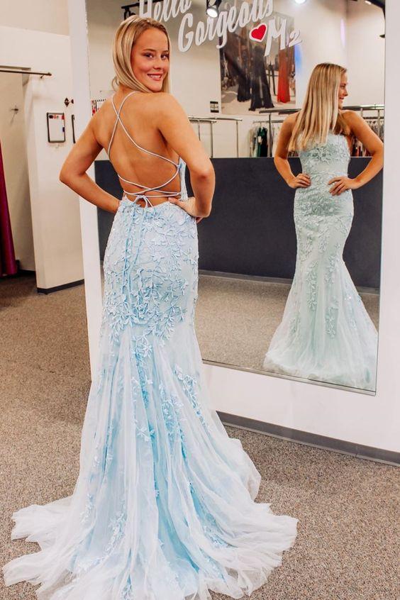 SR1243,Charming Light Blue Applique Mermaid Prom Dresses,Lace Party Dress with Sweep Train