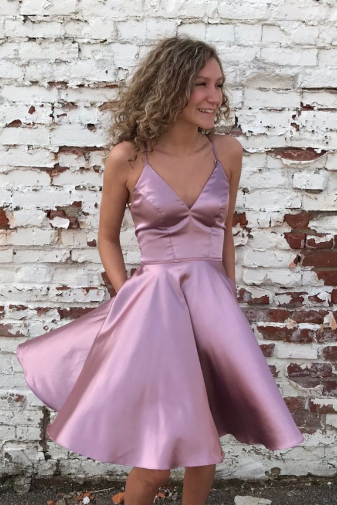 SR1260,Straps Short V Neck Homecoming Dress with Pockets