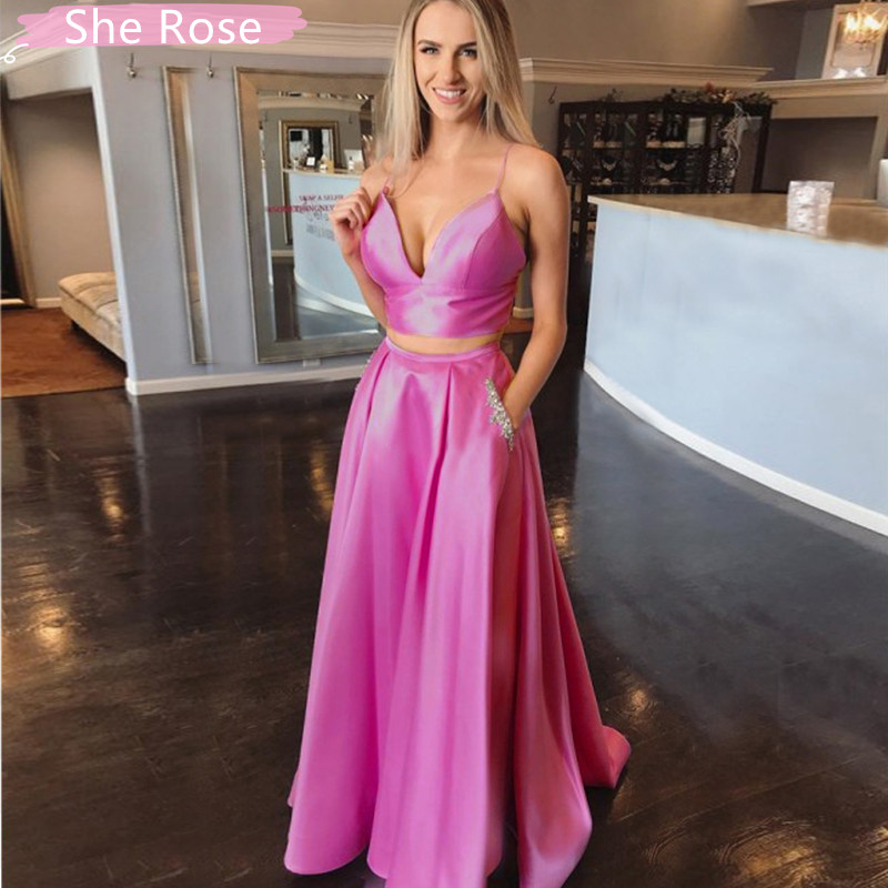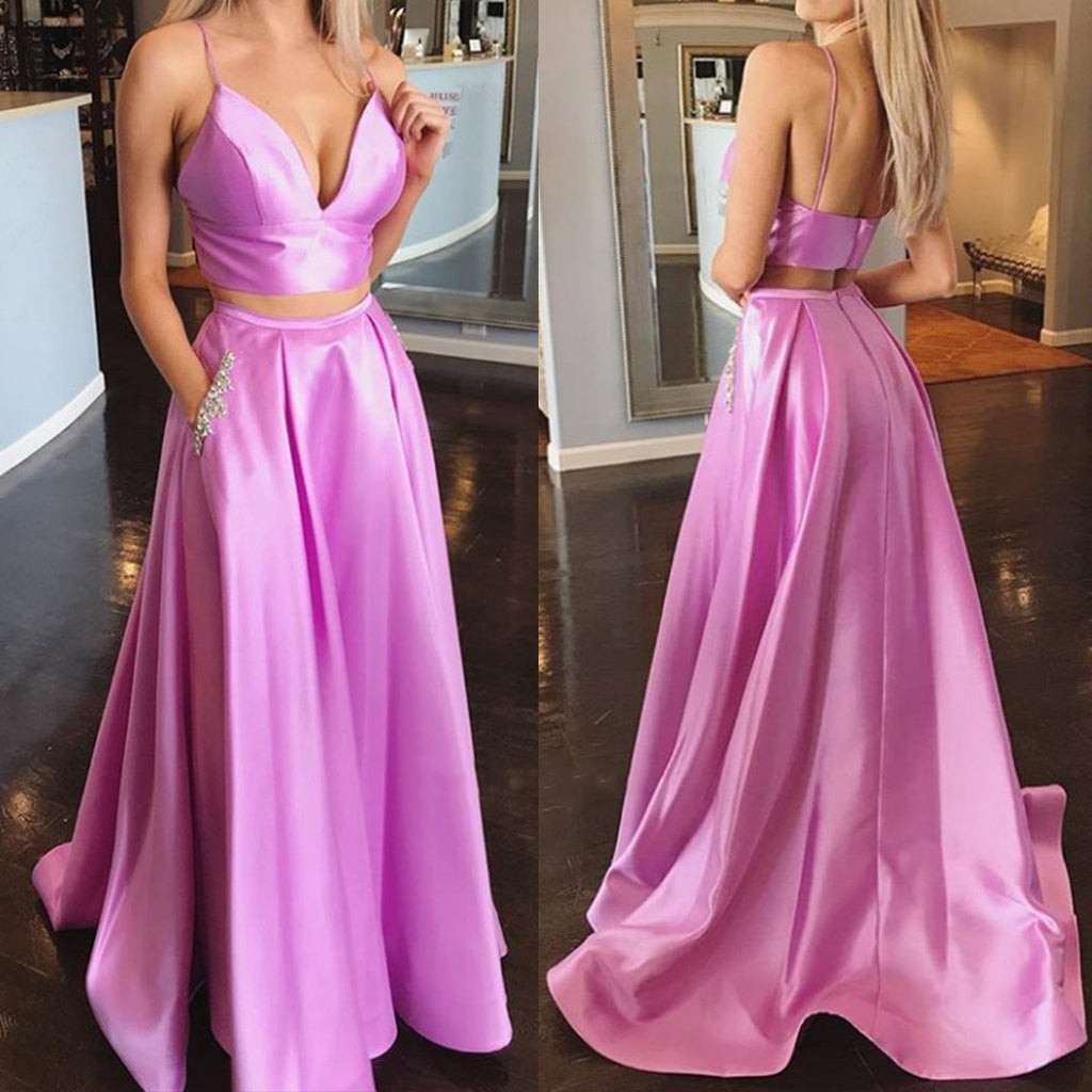 SR1280,Simple spaghetti straps long prom dress with pockets,chic beaded lilac two piece prom dress