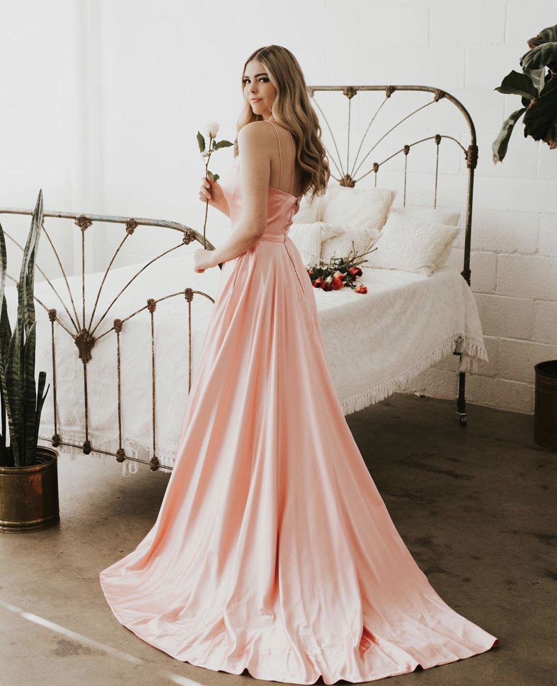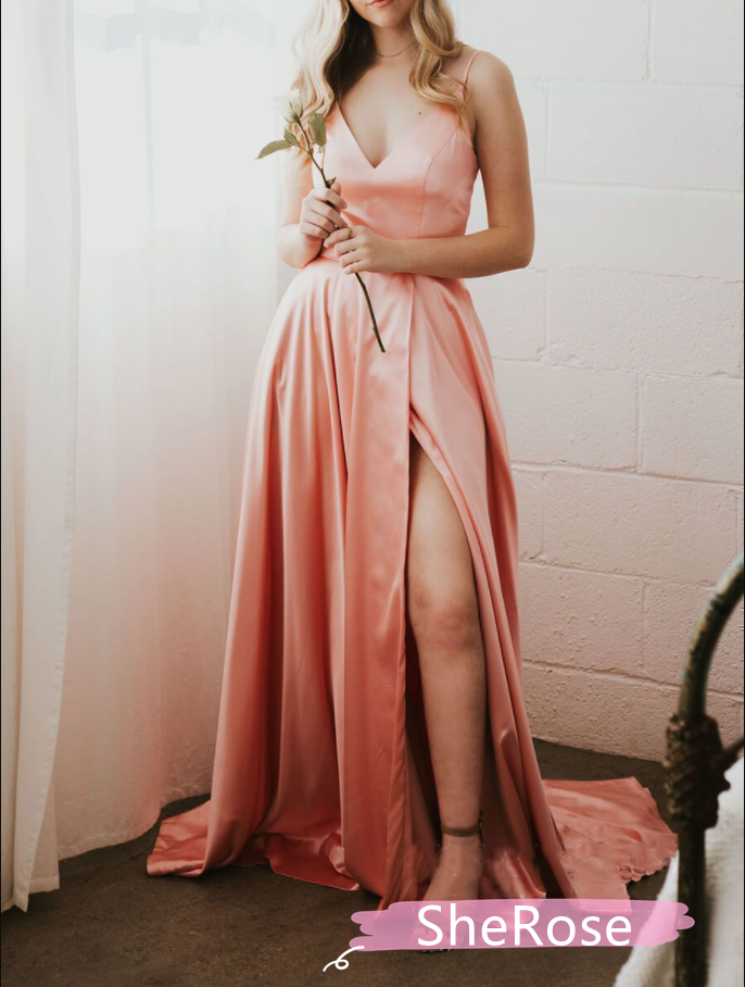 SR1291,Classic Spaghetti Strap Rose Pink Satin Long Prom Dresses with Pockets