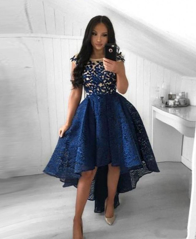 SR1306,Navy Blue Lace Overlay Embellished High Low Cap Sleeve Prom Dresses