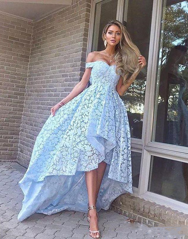SR1307,Lace Prom Dresses Off Shoulder Hi-low Evening Party Gown,Light Blue Lace Homecoming Dresses
