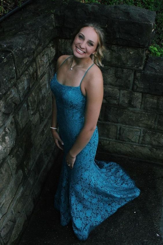 SR1320,Blue Lace Mermaid Dresses,Spaghetti Straps Tight Long Prom Dresses with Sweep Train