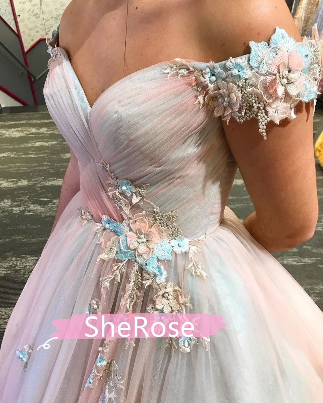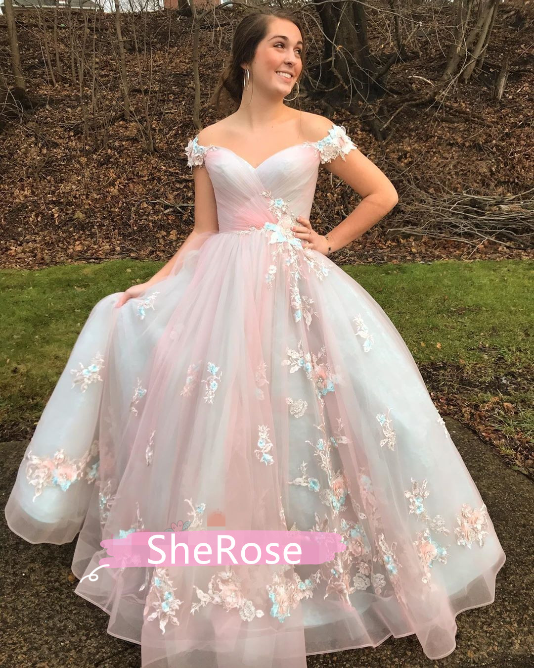 SR1378,Off Shoulder Flowers Applique A line Prom Formal Gown Long Dresses for Girls
