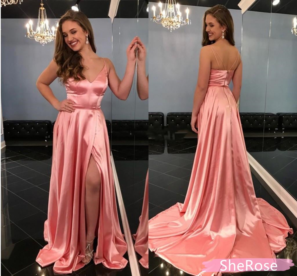 SR1392,A-Line Spaghetti Straps Sweep Train Prom Dress With Split