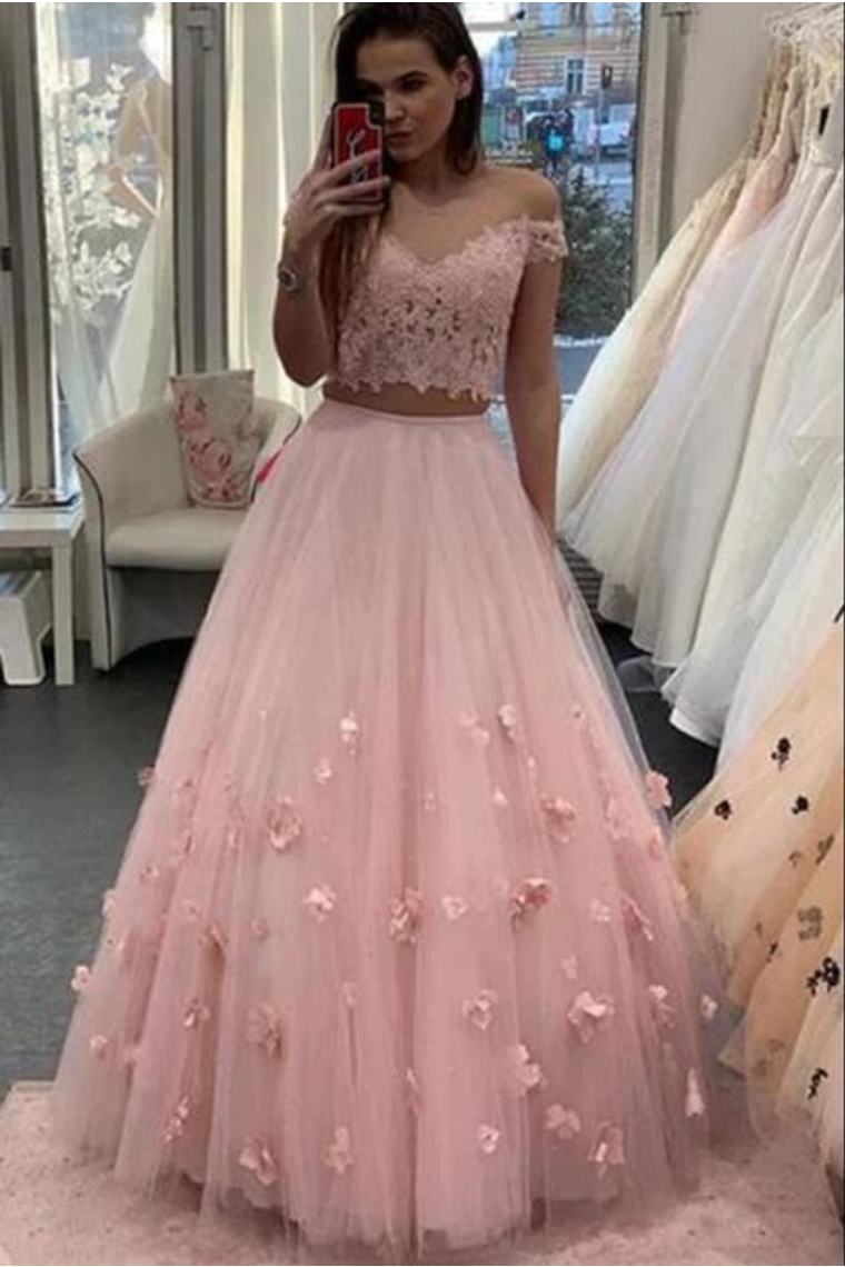 SR1399,2022 Cheap Prom Dresses A Line Pink Two Pieces Tulle Lace Off Shoulder