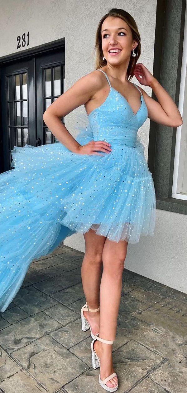 SR1406,Sky Blue Tulle Layers Sequin Starry Homecoming Dresses,Short Prom Dresses