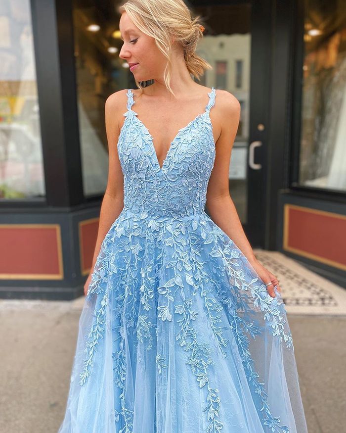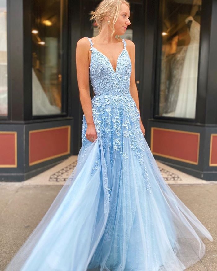 SR1409,Blue Applique Long Prom Dresses V-Neck Evening Party Gown
