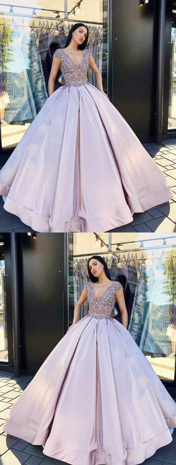 SR1426,Light Pink A line Beading Long Prom Dresses,V neck Evening Gown