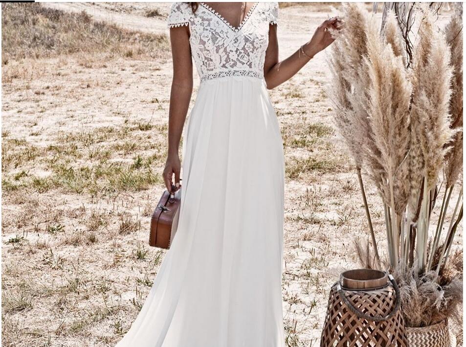 SR1457,Bohemian Wedding Dress Vintage Lace Boho 2021 A-Line Simple Beach Bridal Gowns Chiffon Floor Length V-Neck Brush Train Backless