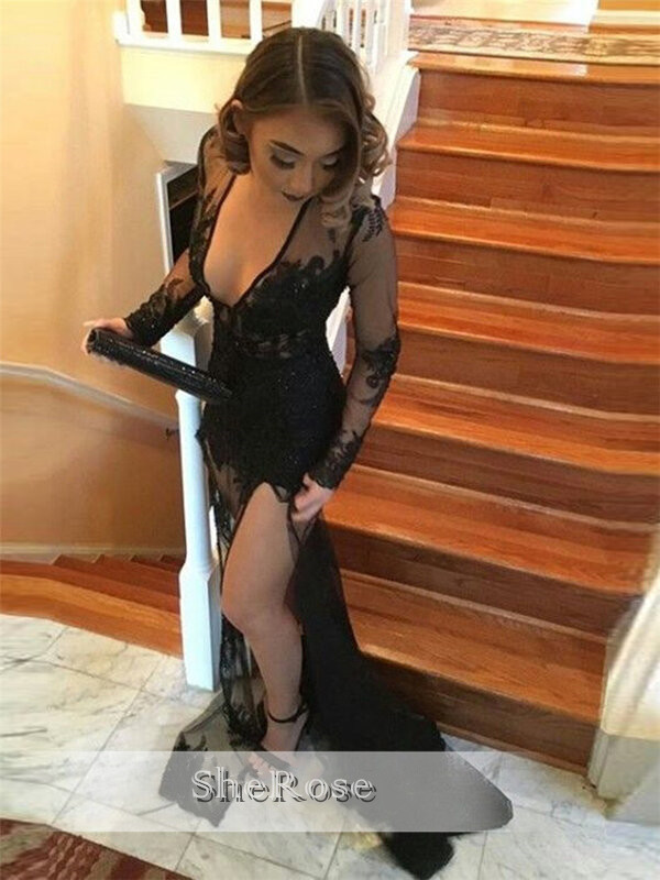 SR1472,Sexy Long Sleeves Sheath Mermaid Black Lace Prom Dress V Neck Women Evening Dress