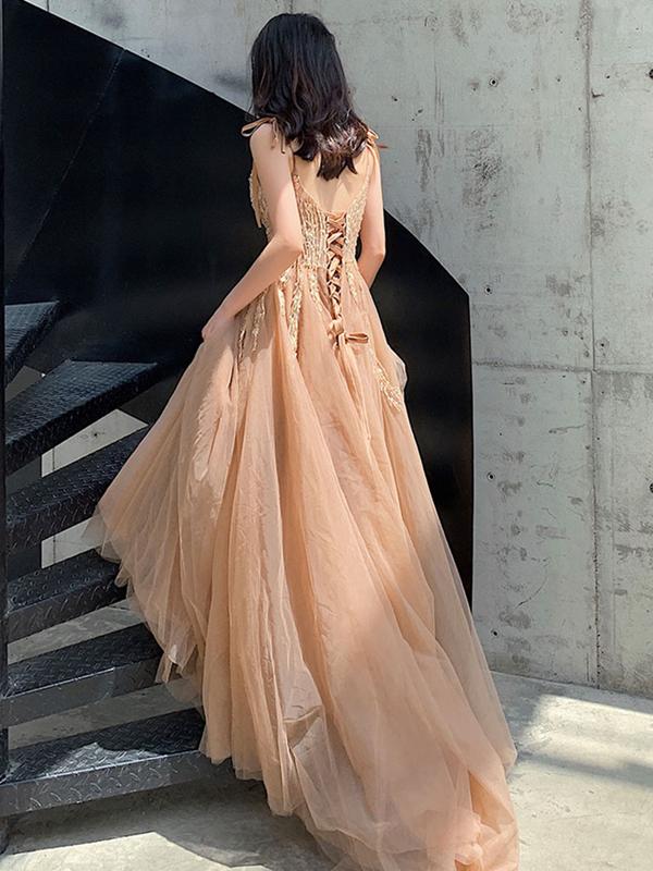 SR1486,V Neck Champagne Lace Prom Dresses, Champagne Lace Long Formal Evening Dresses