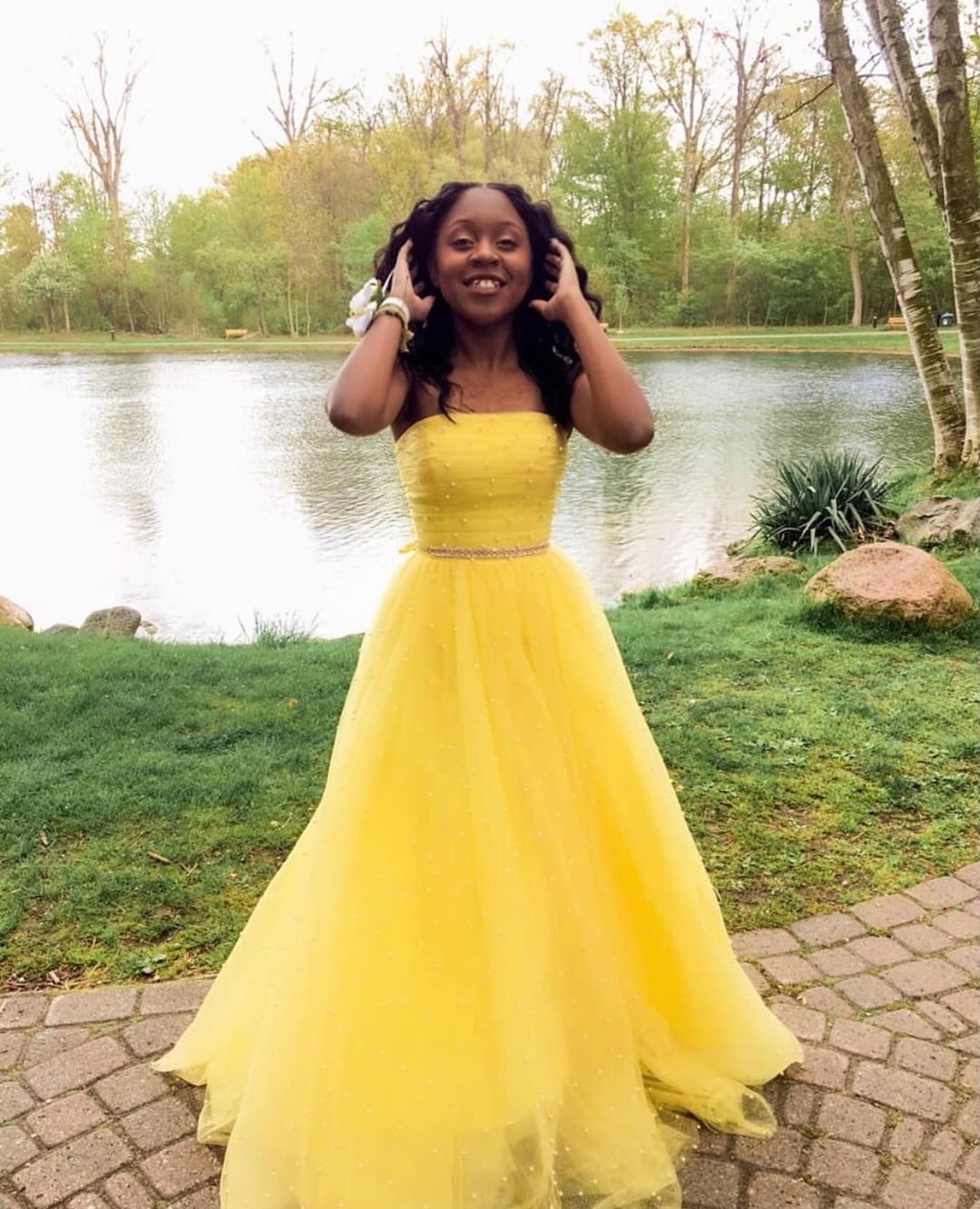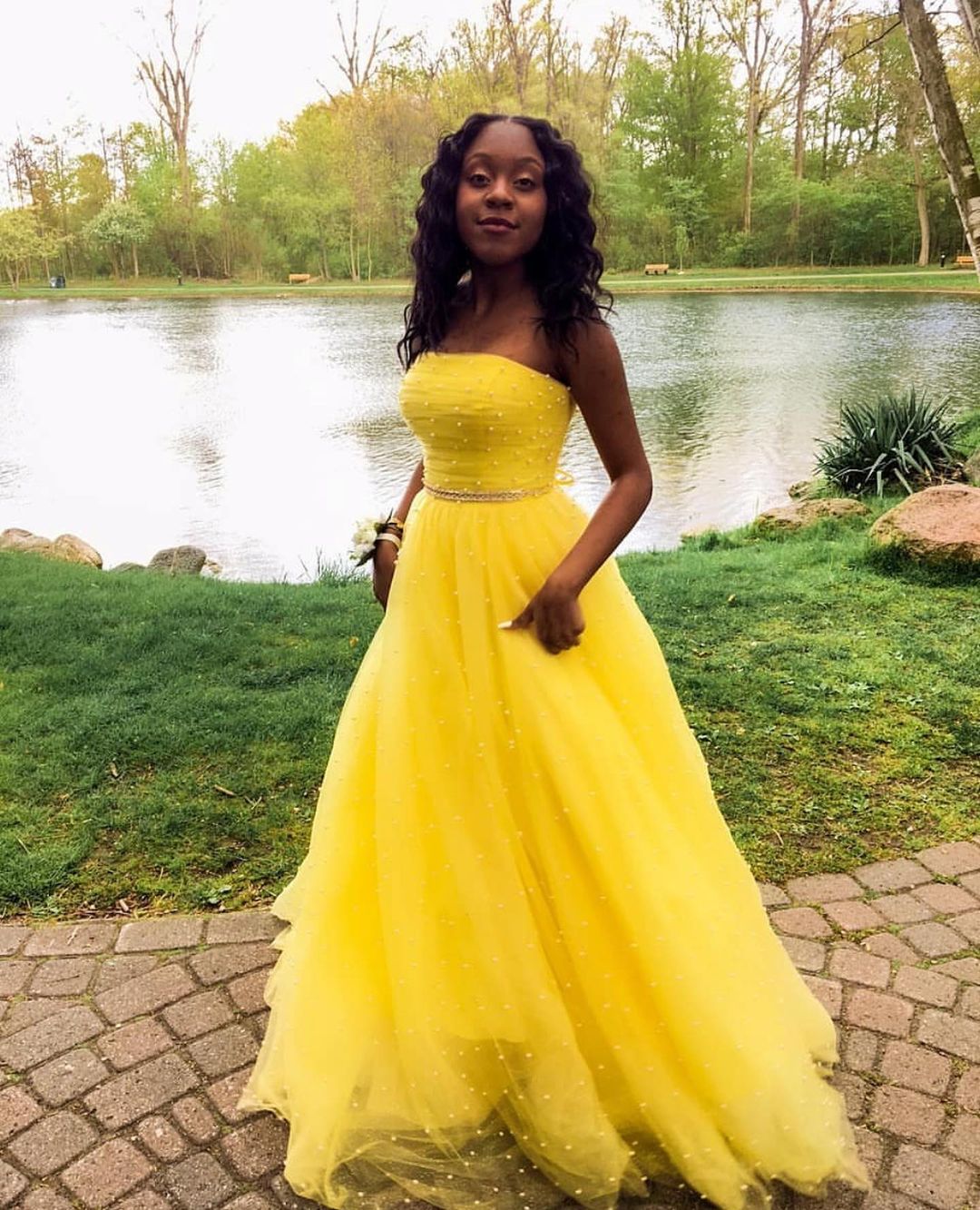 SR1500,Yellow Strapless A-line Pearls Long Prom Dress