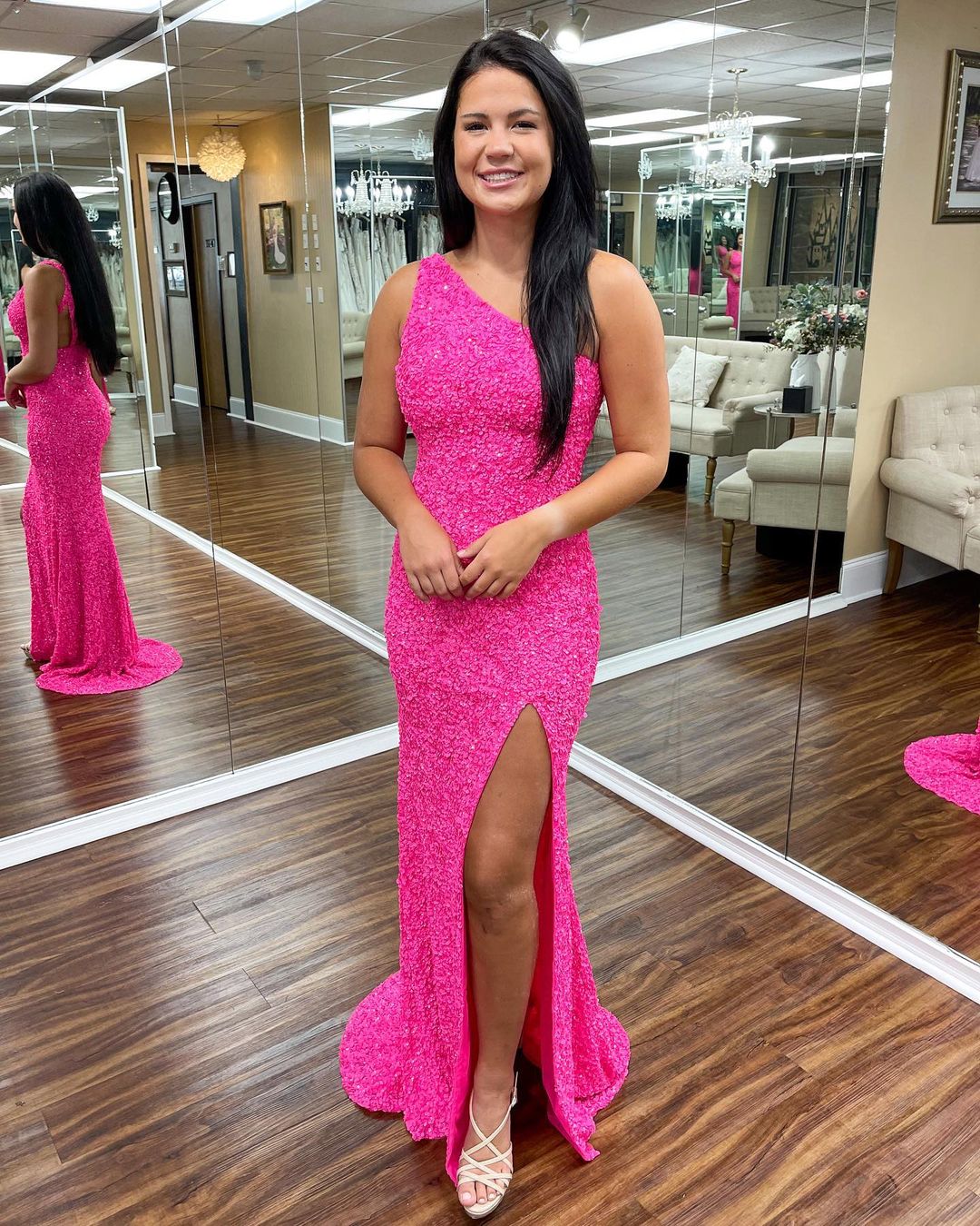 SR1502,Hot Pink Sequins One Shoulder Long Formal Dress
