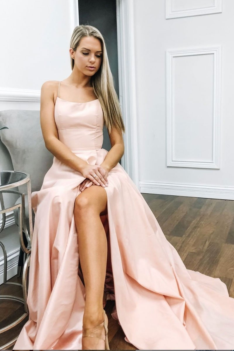 SR1542,Elegant A Line Satin Long Pink Prom Dress with High Slit, Simple Pink Formal Graduation Evening Dress