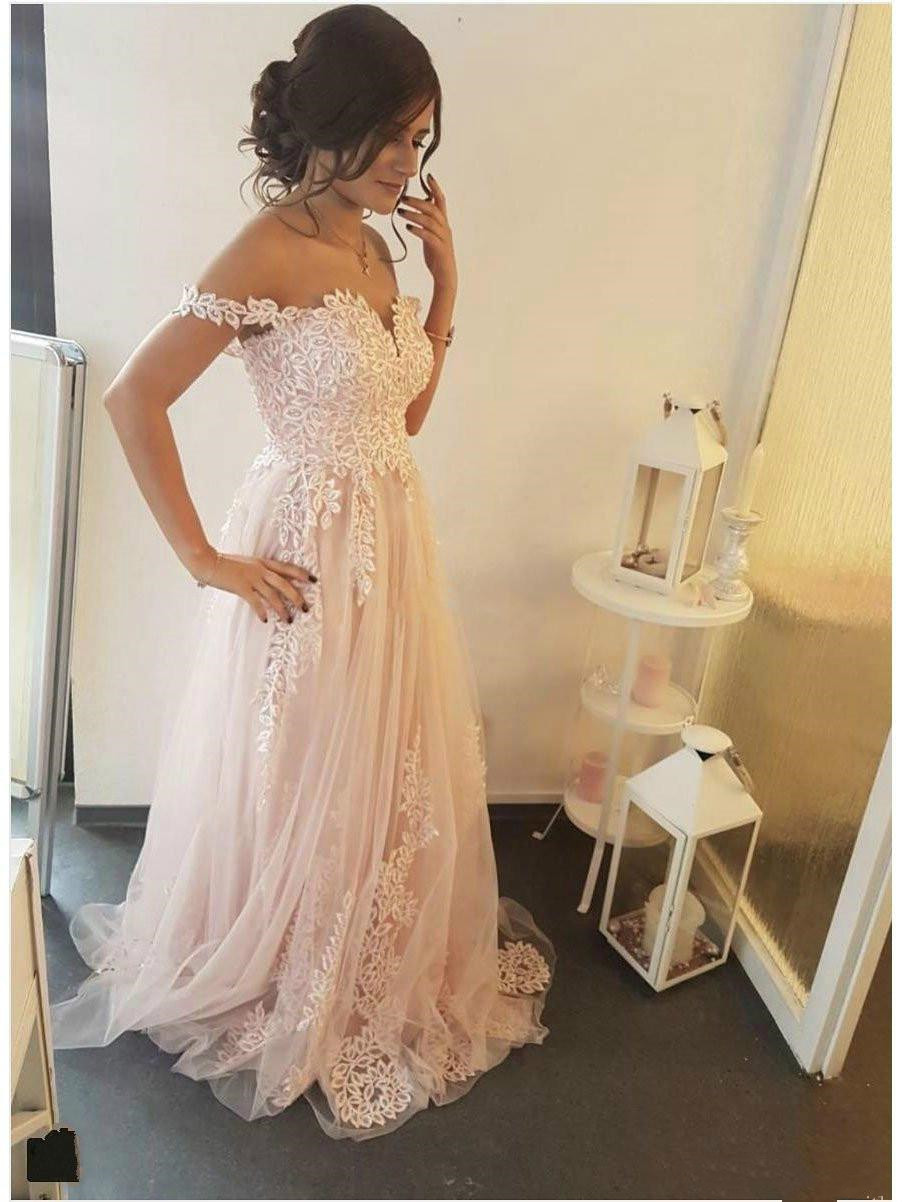 SR1546,2022 Sweet A-Line/Princess Off-The-Shoulder V Neck Applique Tulle Prom Dresses