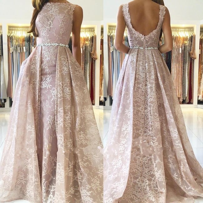 SR1549,Dusty Pink Lace Sheath Prom Dresses O Neck Evening Dresses with Beaded Belt