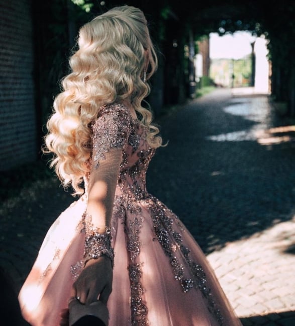 SR1550,Blush Pink Tulle Applique Beaded Long Prom Dresses,Long Sleeves Evening Ball Gown