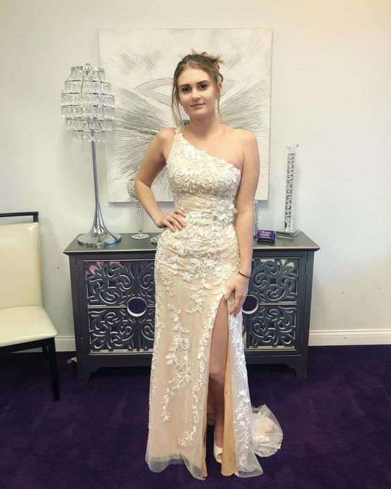 SR1571,Light champagne lace mermaid prom dresses strapless split one shoulder formal gown for senior girls