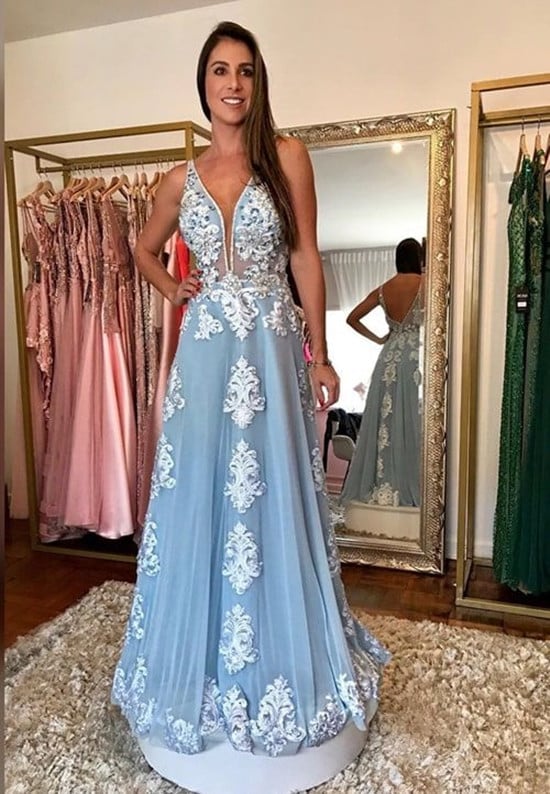SR1596,Deep V Neck Prom Dress,Blue Prom Dress, Lace Applique Prom Dress, Elegant Prom Dress, Prom Dresses Long, A Line Prom Dress
