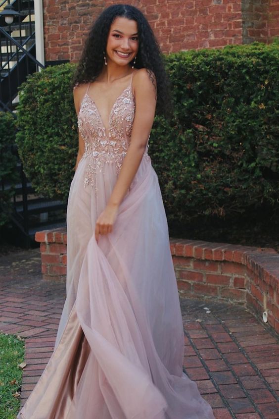 SR1600,Pink Grey Gradient Color Tulle Beading V-Neck Sleeveless Prom Dress with Side Slit