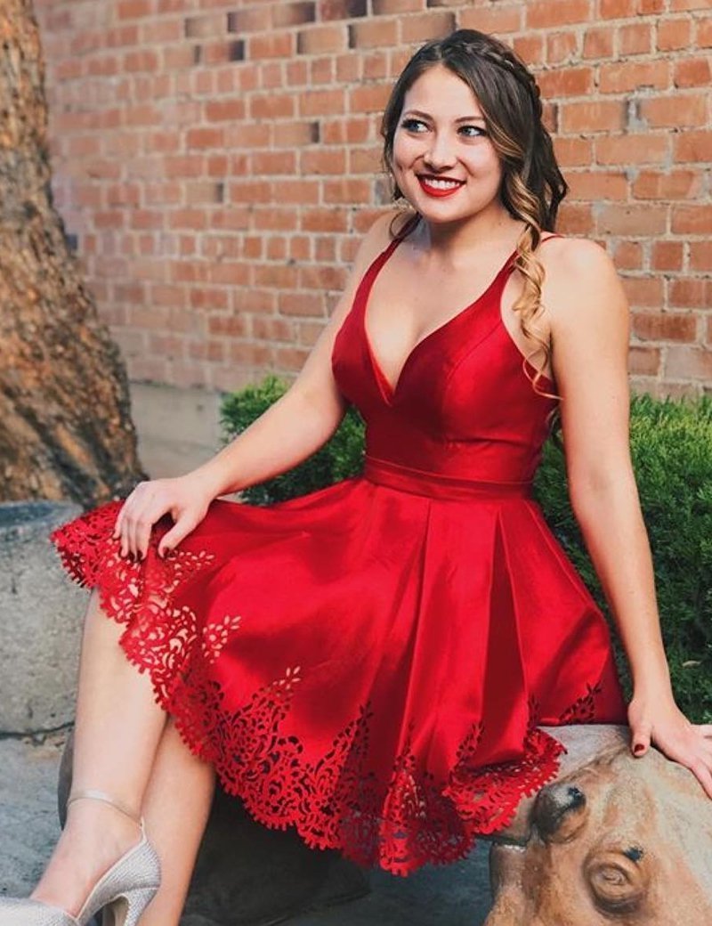 SR1623,A-Line Deep V-Neck Knee-length Red Hollow Homecoming Dress