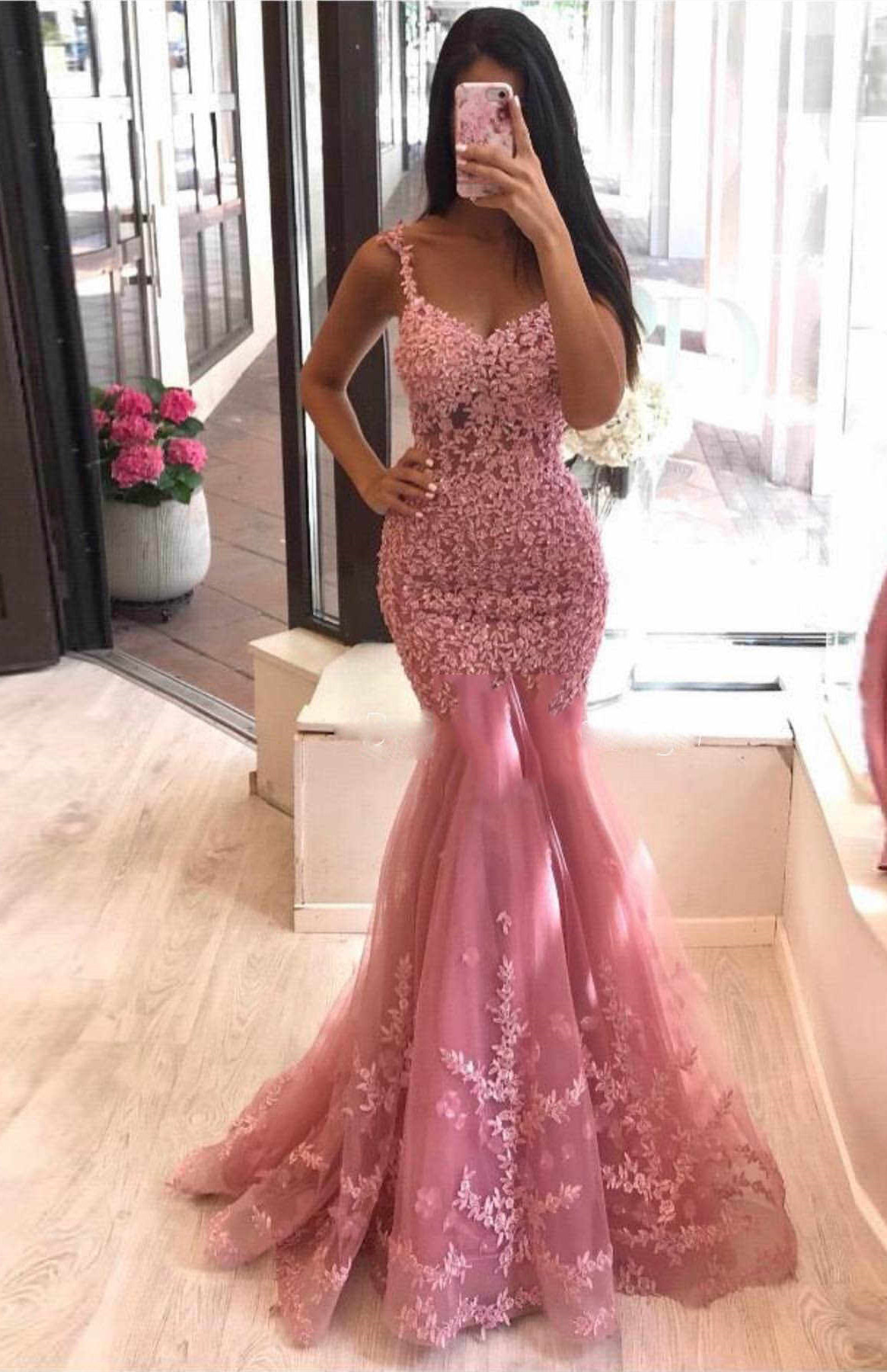 SR1668,Spaghetti Straps Mermaid Pink V Neck Tulle Prom Dresses With Applique
