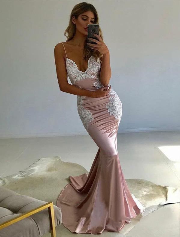 SR1671,Mermaid Spaghetti Straps Backless Sweep Train Pink Prom Dress with Lace
