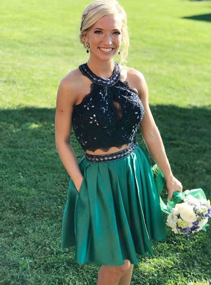 Two Pieces Homecoming Dresses, Halter Black Green Beaded Homecoming Dress