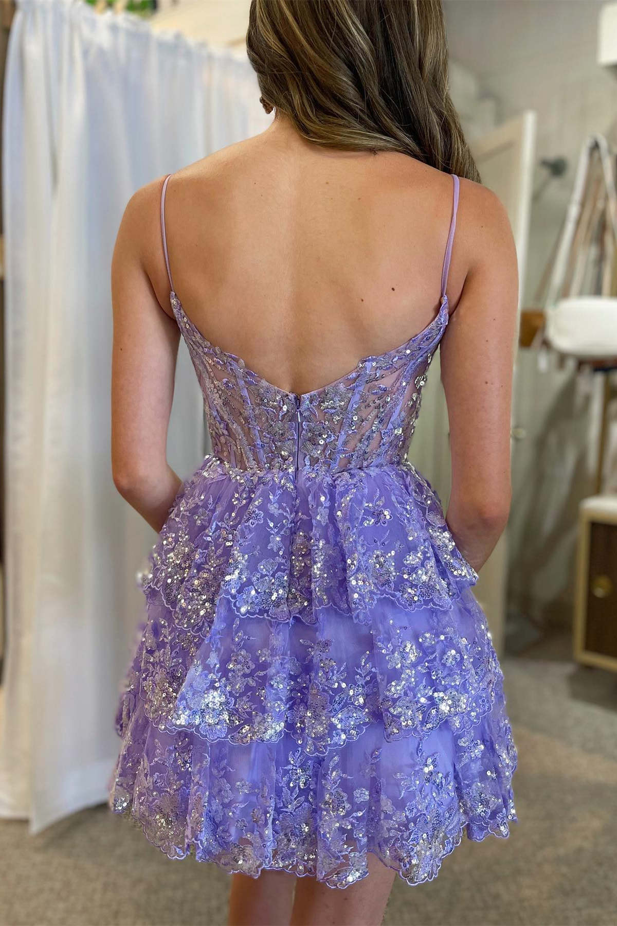 Luxury Purple Lace Sequin Homecoming Dresses V-Neck Spaghetti Straps Mini Dress