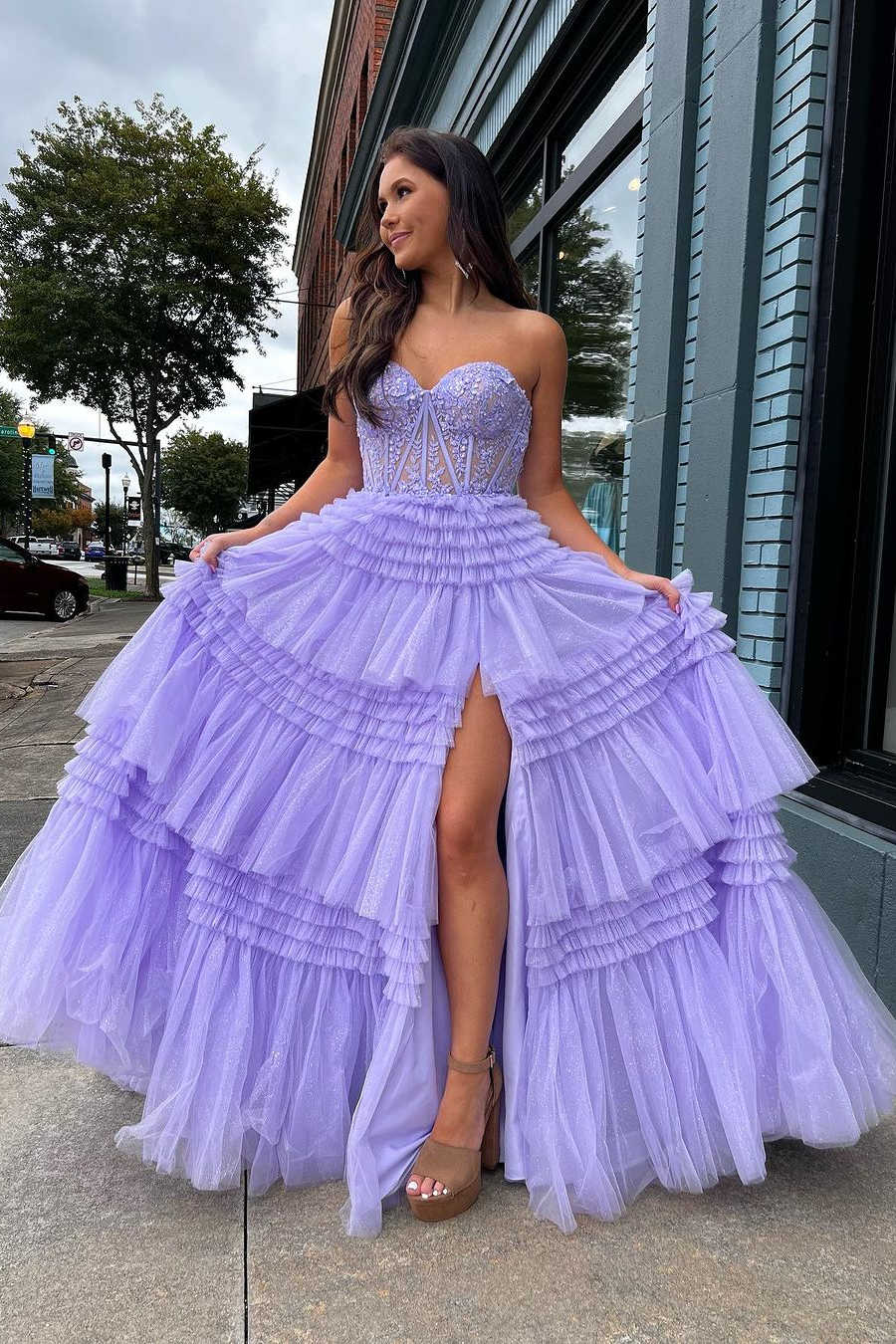 Sweetheart Lilac Strapless Tulle Ruffles Multi Layers Long Prom Dresses