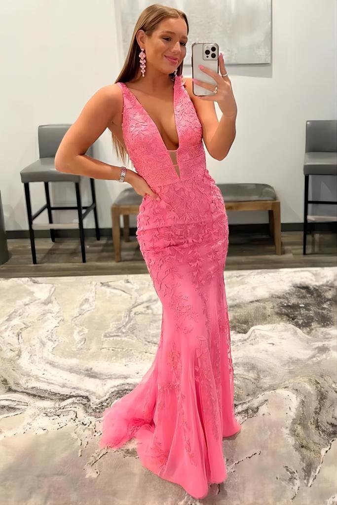 Sweet Deep V-Neck Appliques Long Evening Prom Dresses