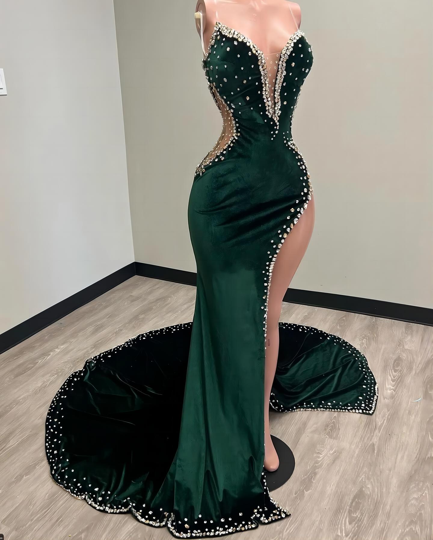 Sexy Dark Green Velvet Beaded Prom Dresses Long Evening Dress