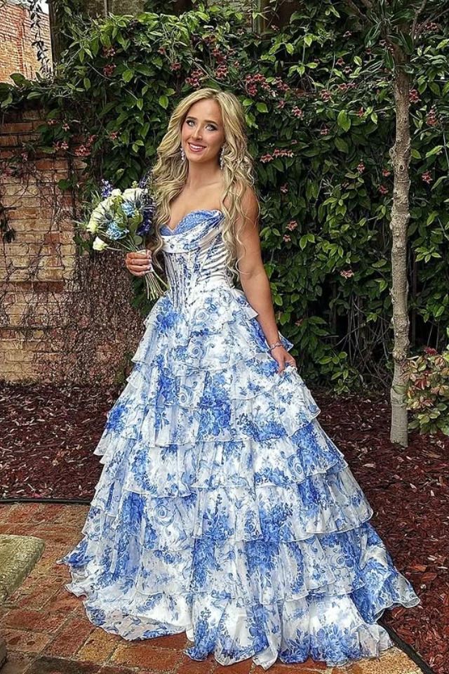 SR505,Charming Floral Chiffon Ruffle Prom Dresses Sweetheart Evening Party Dress